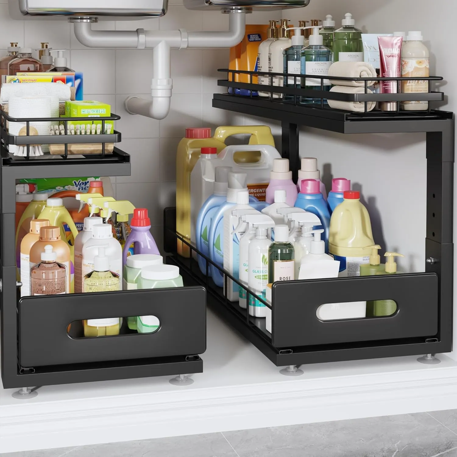 Maximize your kitchen or bathroom storage with this 2-pack, 2-tier pull-out cabinet organizer. Featuring 21” deep shelves and smooth sliding rails, it easily fits under sinks or in cabinets, providing convenient access to all your items while keeping spaces organized.